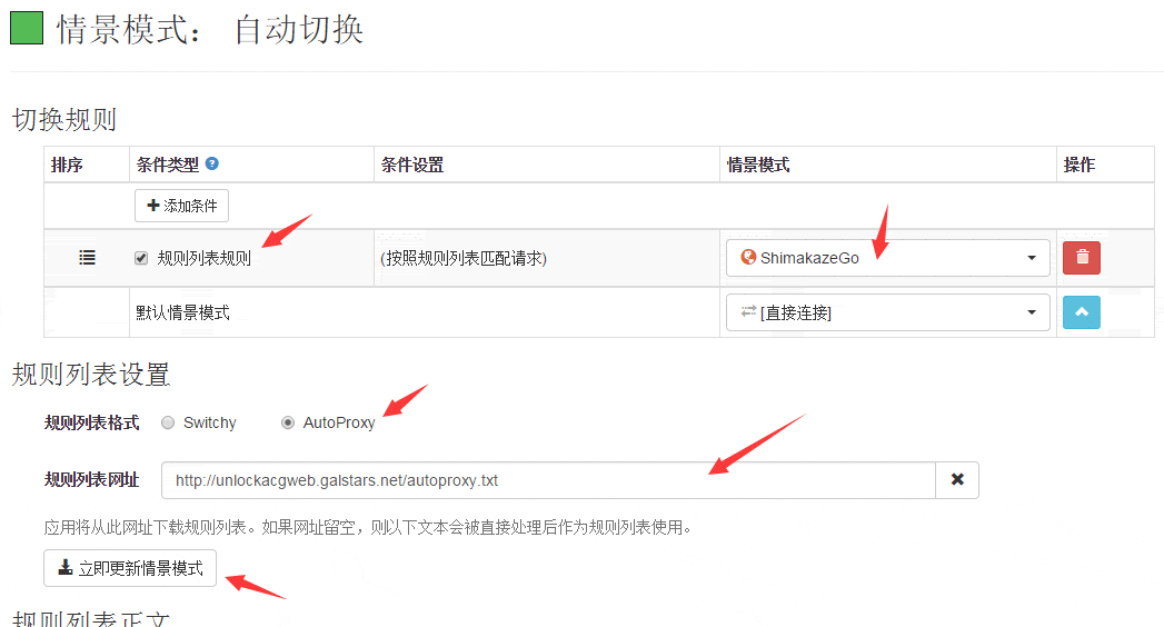 按钮,并将最上方的『规则列表规则』对应的情景模式选择为刚才创建的“ShimakazeGo”规则。