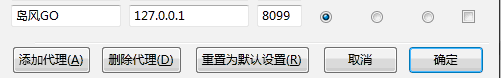 添加一个代理,名称任意(这里假如为岛风GO),代理主机为127.0.0.1,端口填写为岛风GO设置窗口上的『本地端口号』(未修改过的话即为8099),代理类型为http,然后点击确定按钮