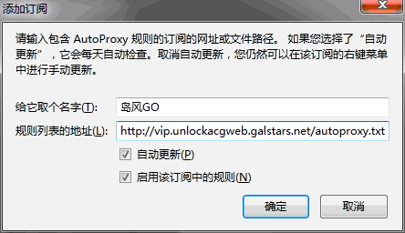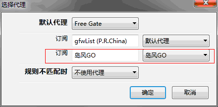 然后将刚才添加的“岛风GO”这个订阅右边的代理选择为刚才添加的“岛风GO”代理,再点击确定按钮即可(如果没有找到“岛风GO”这个订阅,关闭AutoProxy主窗口后重新打开再进来就有了)