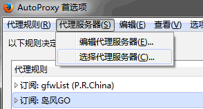 回到AutoProxy插件的设置主界面,点击菜单中的『代理服务器』-『选择代理服务器』