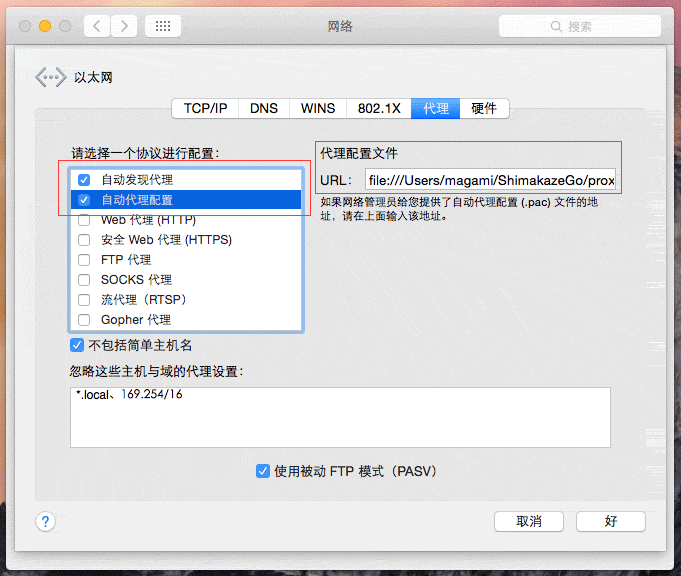 再将上图红框中的『自动发现代理』和『自动代理配置』选项启用,并在『自动代理配置』右边的“代理配置文件”输入框中输入岛风GO全局设置窗口(右键点击桌面右下角的岛风GO图标-打开全局设置)中的“PAC自动代理脚本地址”中的内容,按下“好”按钮并在上个窗口上点击右下角的“应用”按钮后就设置完成了。